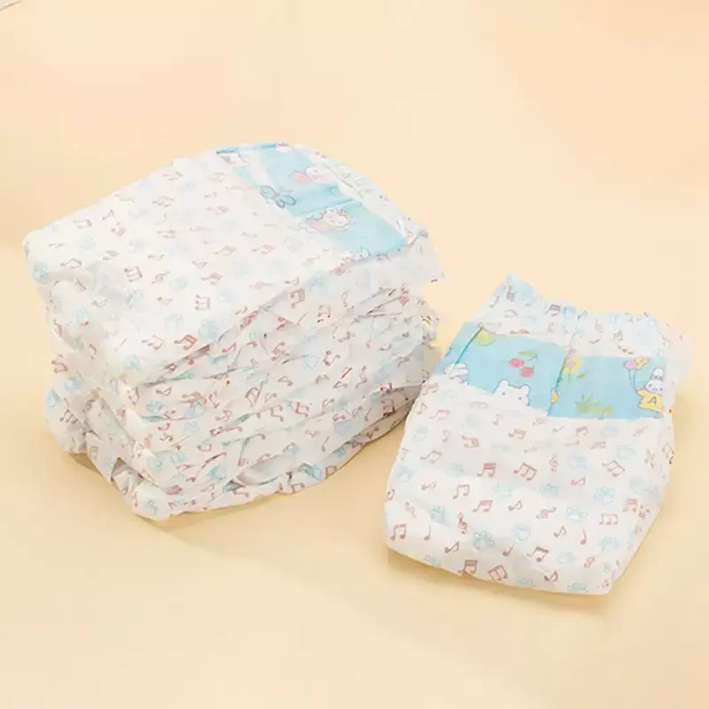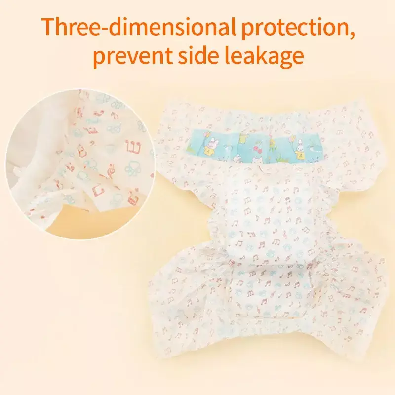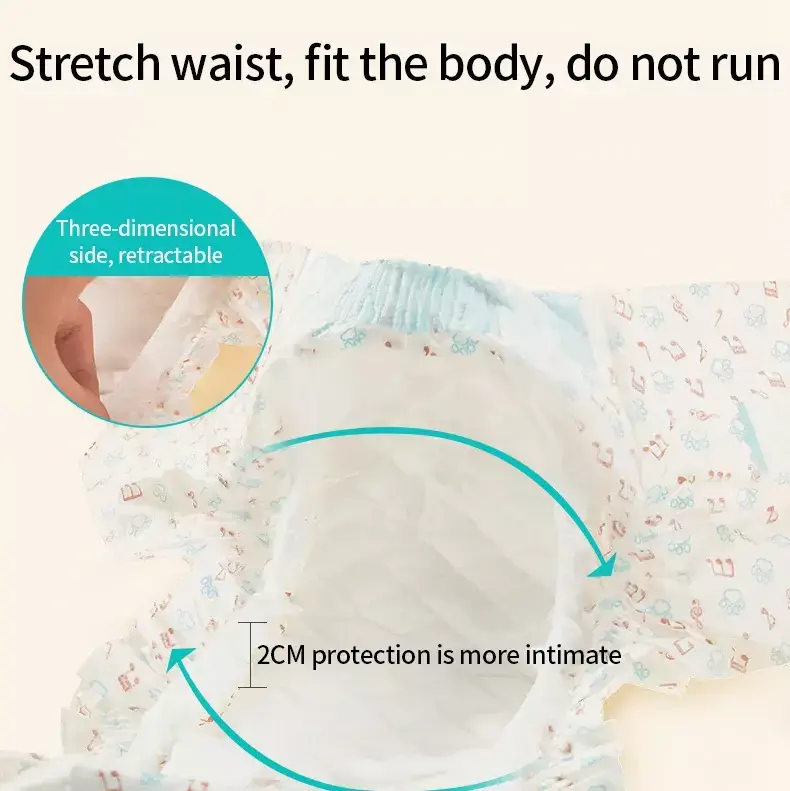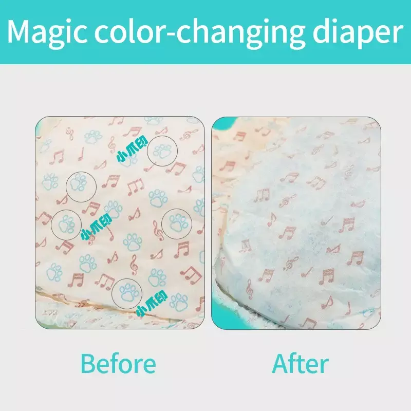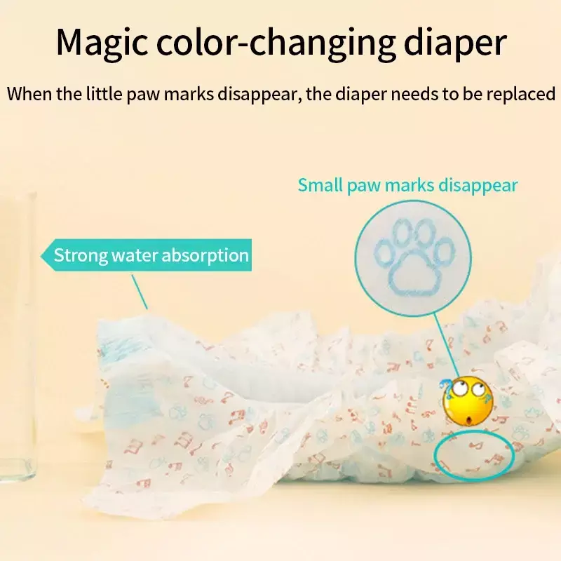 Características: 1.Material não tecido: As fraldas são feitas de material não tecido de alta qualidade, que é muito confortável e agradável à pele. 2.Descoloração: Quando a fralda estiver cheia, a pequena nota na superfície desaparecerá, lembrando o proprietário de trocar a fralda. 3.Cintura elástica: A cintura é elástica, pode ficar próxima à cintura, não é fácil de cair.